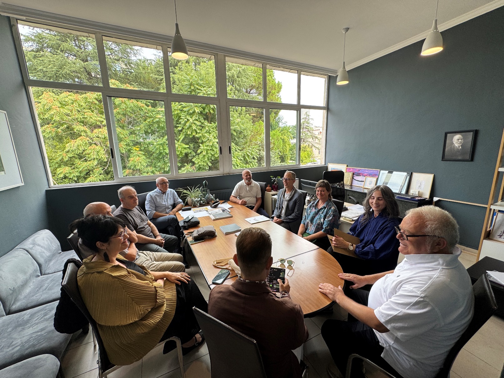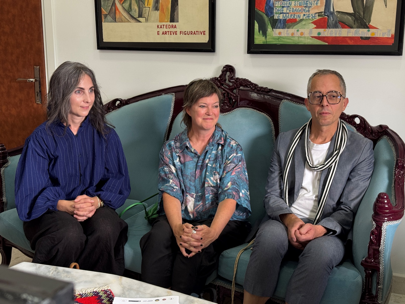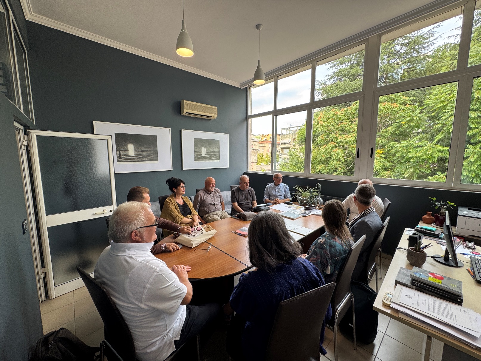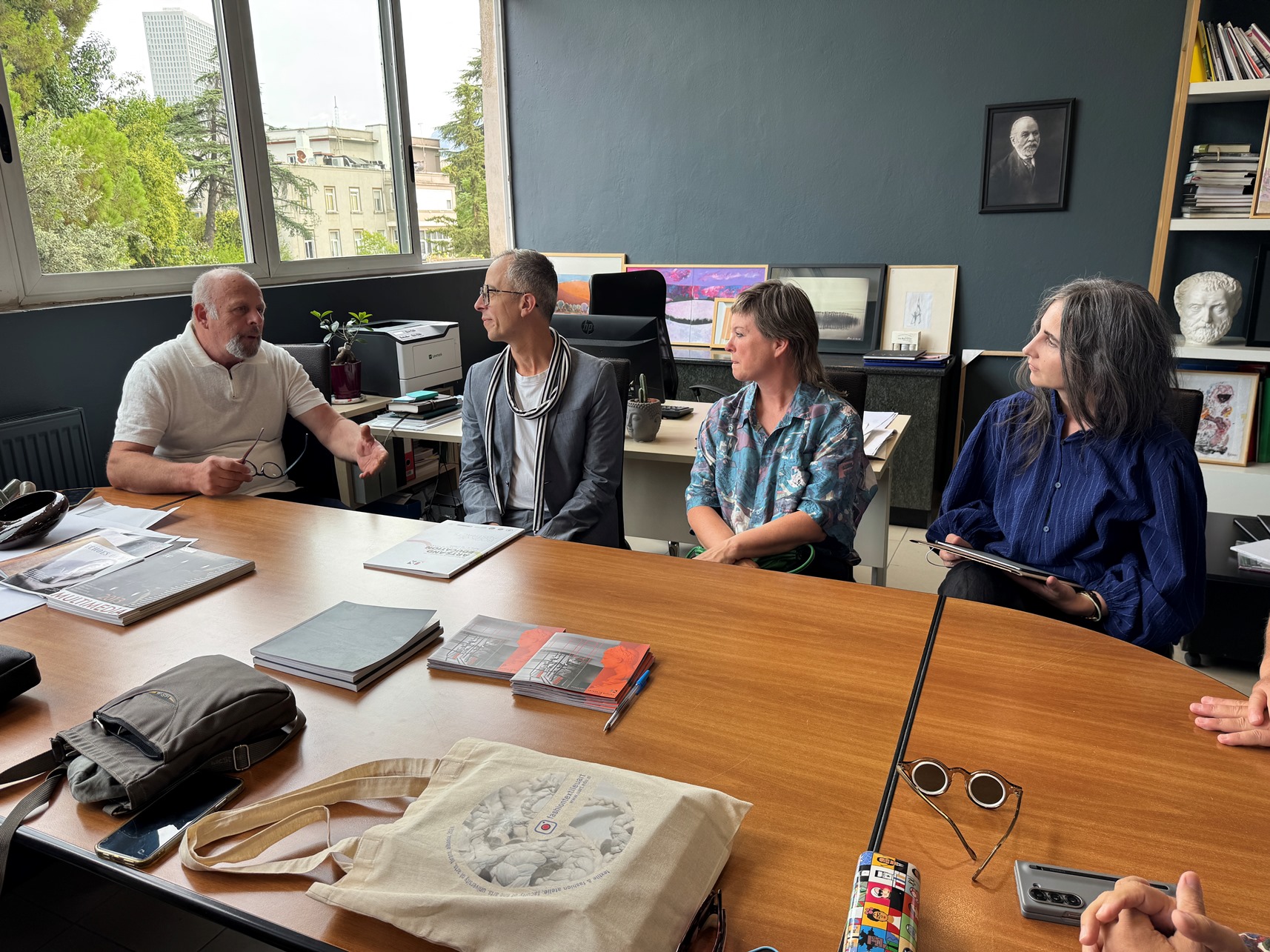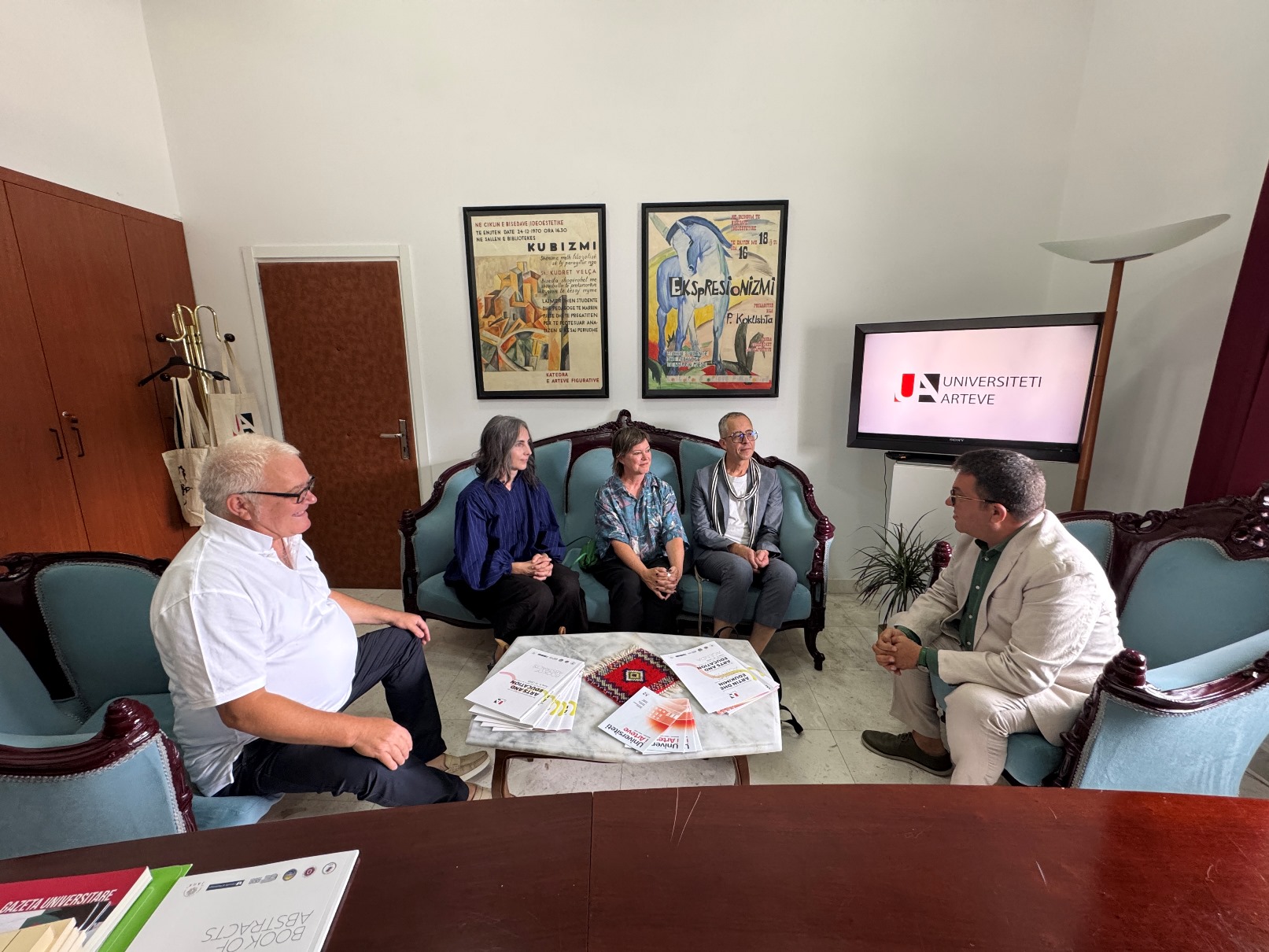 Më tej, delegacionit iu rezervua një pritje në Dekanatin e Fakultetit të Arteve të Bukura, ku, përveç Dekanit Prof. Sadik Spahija, të pranishëm ishin Zëvendës Dekani Prof. Asoc. Albes Fusha, Prof. Najada Hamzaj, Prof. Asoc. Dr. Zef Paci, Prof. Asoc. Dr. Ardian Isufi dhe Prof. Asoc. Edmond Gjikopulli, ku dhe u prezantuan strukturat e programeve të studimit të të dy institucioneve si nga ana e Dekanit Antonio Cataldo, Dekanit Spahija si dhe drejtueses së Atelierit të Tekstil – Modë Najada Hamzaj.