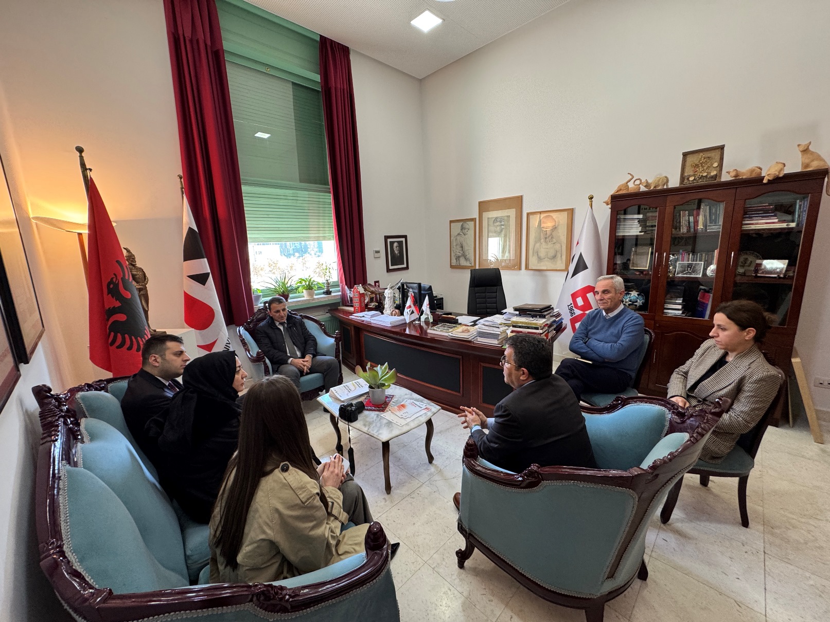 Ditën e mërkurë, më datë 25.02.2026, Rektori i Universitetit të Arteve, Prof. Dr. Erald Bakalli, i shoqëruar nga Zëvendësrektori, Prof. Arian Paço, mirëpriti në zyrën e tij z. Mustafa Ata, Koordinator i TIKA-s në Shqipëri (Tiranë), znj. Nagehan Uslu, Zëvendëskoordinatore e TIKA-s, si dhe z. Oğuzhan Sakoğlu, Drejtor i Institutit Yunus Emre, shoqëruar nga stafi i tyre përkatës.